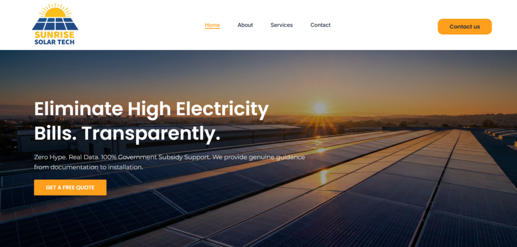 A corporate website for sustainable energy solutions. It highlights solar products and services with a clean, eco-friendly design that drives customer inquiries.